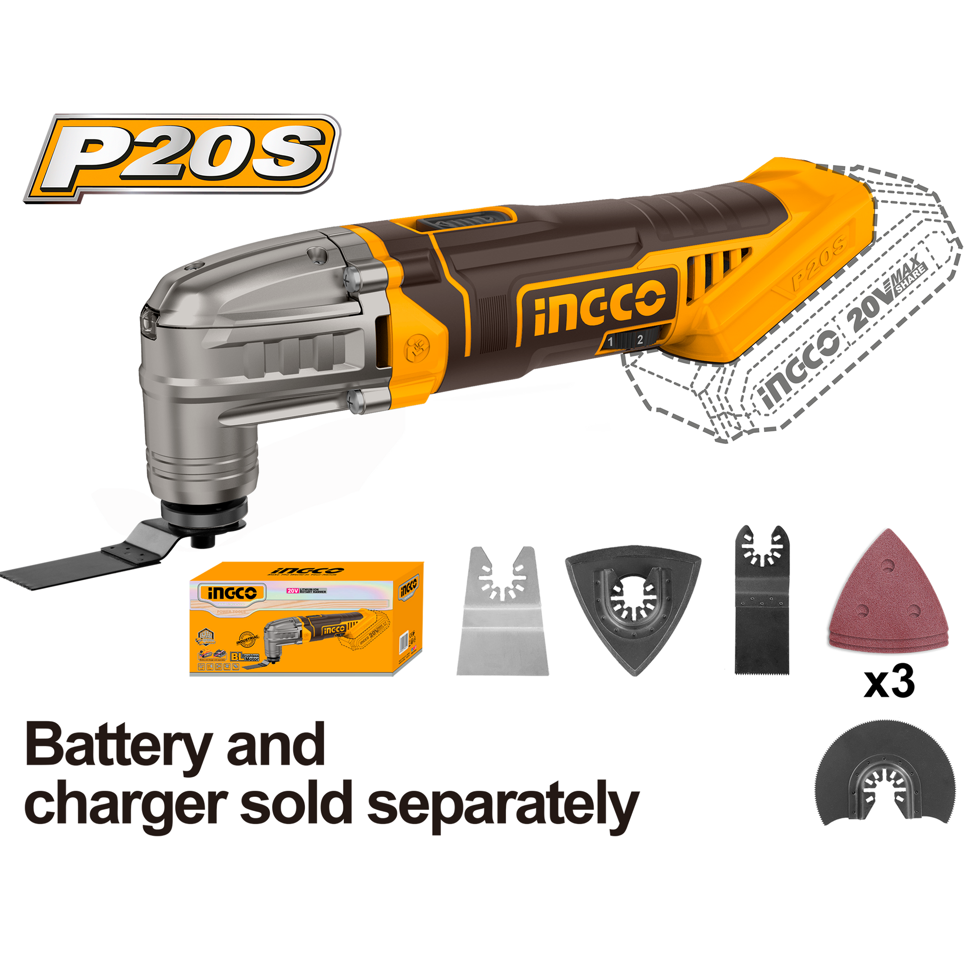 Ingco aku multi alat 20V CMLI2022 isporučuje se bez baterije i punjača.